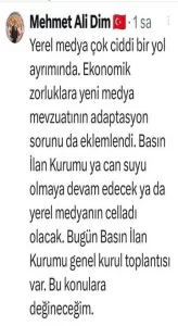 Başkan Mehmet Ali Dim “Yerel medya çok ciddi bir yol ayrımında. Ekonomik zorluklara yeni medya mevzuatının adaptasyon sorunu da eklemlendi. Basın İlan Kurumu ya can suyu olmaya devam edecek ya da yerel medyanın celladı olacak.